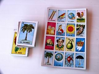 La lotería: “El corazón”, “El Diablo”, “El gallo”… “Loteria” Es un juego en el que cada jugador compra unos cartones decorados con determinados dibujos o símbolos muy representativos y con diseño popular mexicano, que se cantan en versos a los presentes con una baraja. El primero que consigue completar su cartón acapara el dinero de todos. Este es un juego popular y que no puede faltar en las reuniones familiares mexicanas y es muy común jugarla en las ferias de los pueblos donde podrás ganar otros juguetes mexicanos.